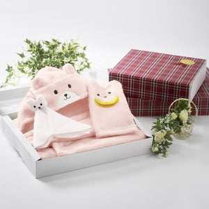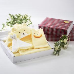 無撚糸パイル素材のバスポンチョセットです。バスミトン、ハンドタオルとの3点セット。出産祝いやプレゼントにおすすめのアイテムです。