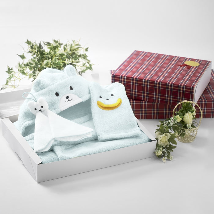 無撚糸パイル素材のバスポンチョセットです。バスミトン、ハンドタオルとの3点セット。出産祝いやプレゼントにおすすめのアイテムです。