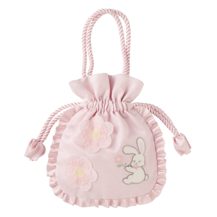 ピンク色の空に浮かぶ、お花のようなふわふわのピンク色の雲に乗って遊ぶチエコをイメージしたシリーズの巾着バッグです。サテンの光沢感が上品で、ドレッシーなスタイルに合わせたい巾着バッグ。