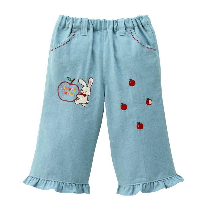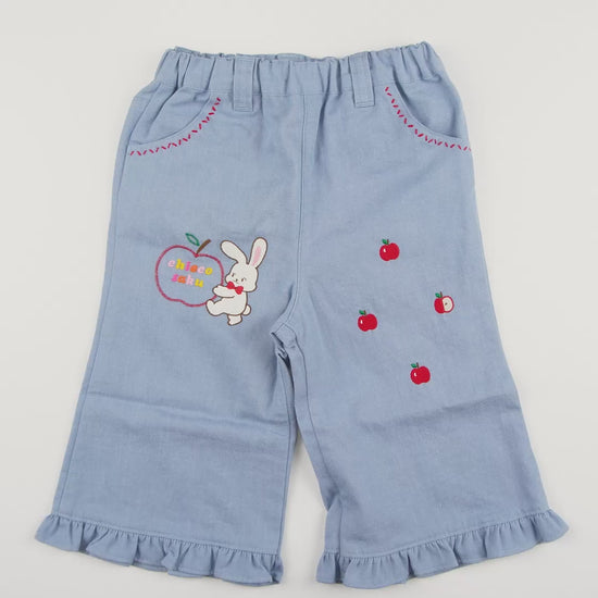 裾のフリルがかわいい女の子らしい9分丈フレアパンツです。少し懐かしいレトロ感のあるデザイン。ゆったりシルエットで、春先からのお出かけにおすすめです。