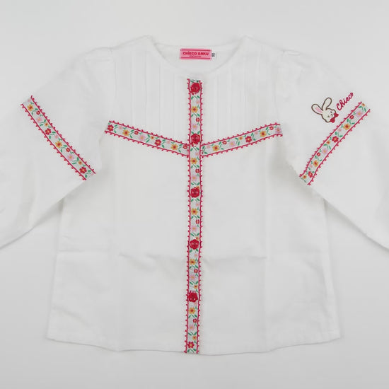 お花のチロリアンテープがアクセントになったブラウス(長袖)です。チロリアンシリーズのジャンパースカートや、スカートと合わせたり、ボタンを開けて羽織ったりなど、春のお出かけが楽しくなる着回しのきくアイテムです。