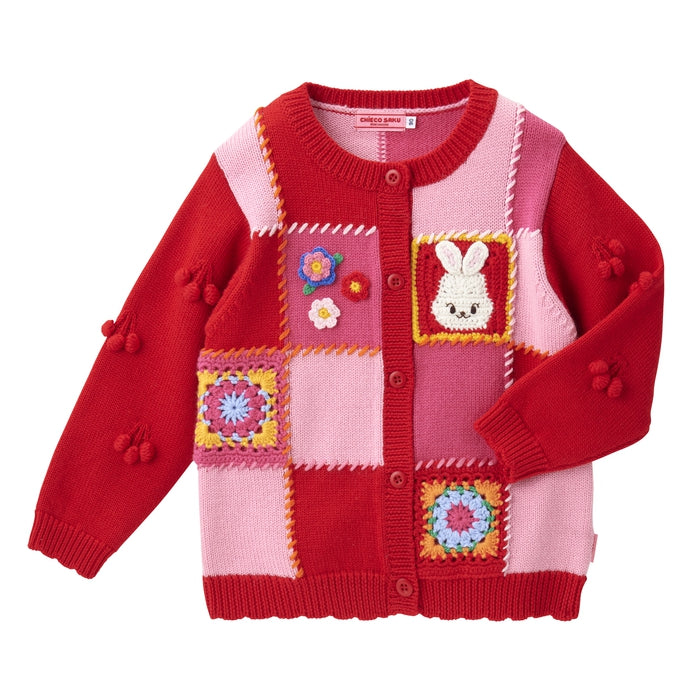 かぎ針編みや立体お花のモチーフ、配色ステッチなど、細部までこだわったニットカーディガンです。寒くなったら、はおりものに便利なカーディガン。パッチワークシリーズや、チエコサクチェックのボトムスと合わせて、かわいらしさが詰まったコーディネートがおすすめ。お揃いのヘアバンドやニット帽、ブーツなどのアイテムと合わせたあったかコーディネートもイチオシです。