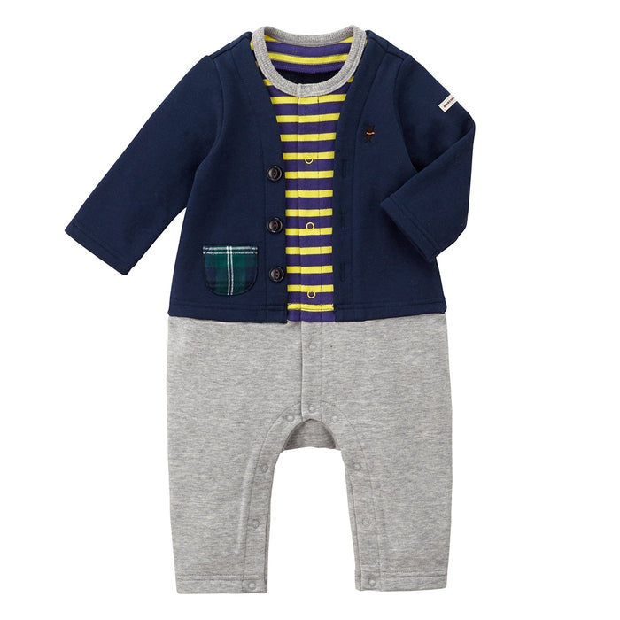 カーディガンを羽織ったようなセパレート風の印象を与えるカバーオールです。