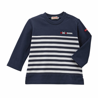 This is a long-sleeved striped T-shirt with Miki House LOGO embroidery.