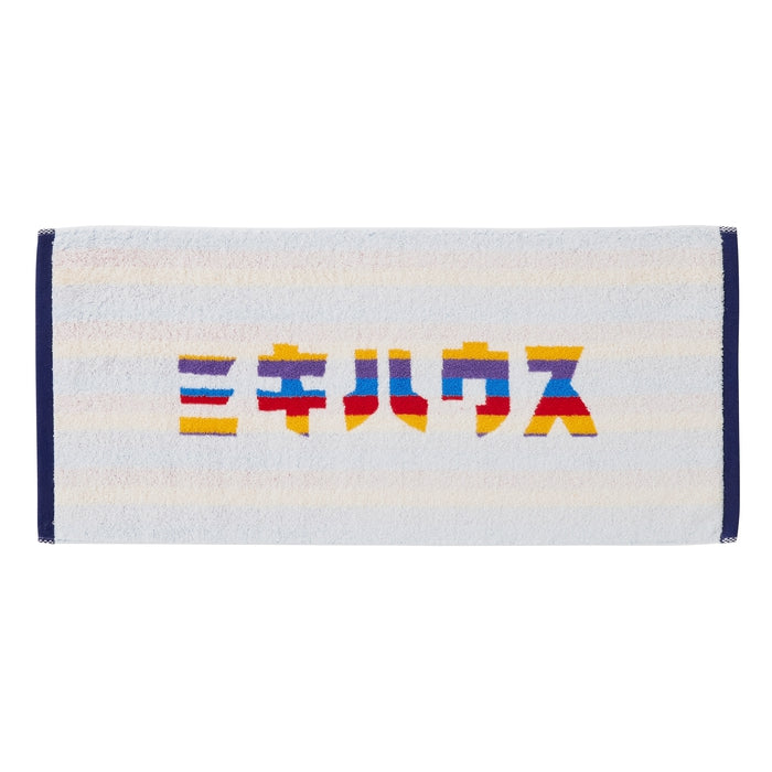 In katakana, "MIKI HOUSEThis face towel is expressed in a colorful striped pattern.