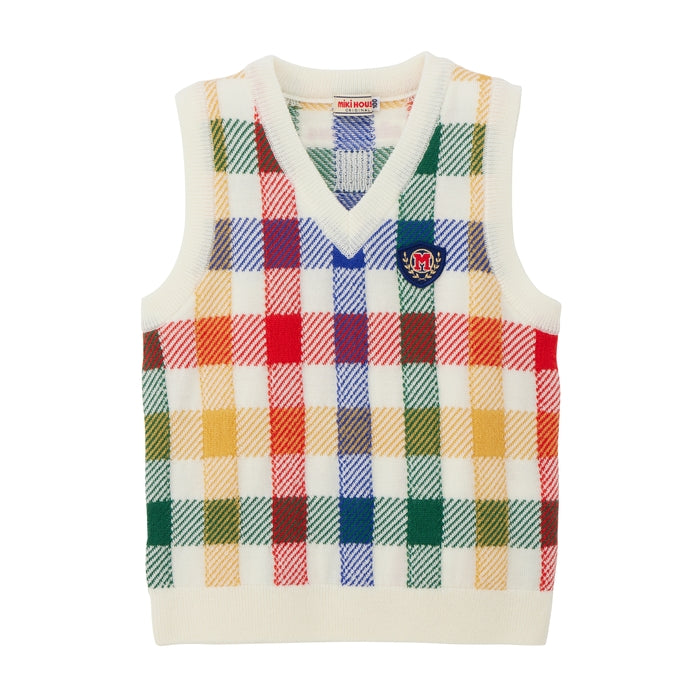 かわいらしいマルチ配色のチェック柄ですが、左胸のエンブレムが気品ある雰囲気のベストに仕立てあげています。