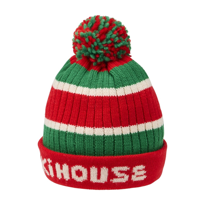 折り返しのロゴとトップのぼん天が印象的なニット帽子です。