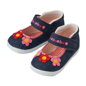 One strap type second shoes made of soft fabric. The strap part is a very adorable shoe with a large flower applique on the instep. The point is also a gingham check of the logo embroidery, piping and insole such as pink and red.