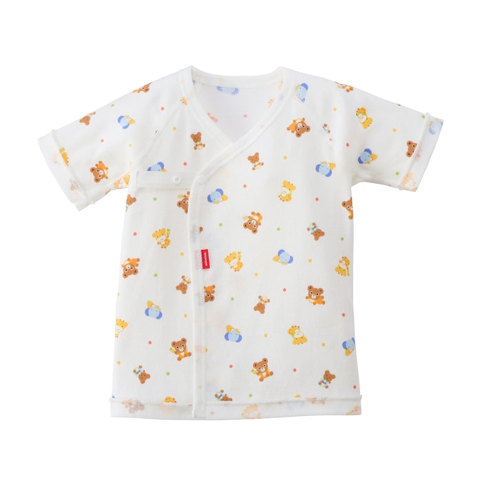 一年中いつでも快適に着ていただけるフライス素材の短肌着です。ミキハウスで人気の柄が、ベビー柄のベビープッチー・ベビーアニマル柄で登場。男の子に人気の乗り物のプリント柄も登場。お着替えをより簡単にできるホック仕様の新生児肌着。出産準備の基本アイテムです。