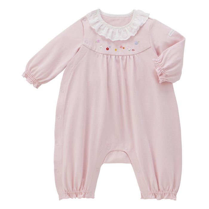 This is an elegant and cute coverall (long-sleeved romper) with a white collared lace. Can be used for short outings. Recommended for preparing for birth or as a baby shower.