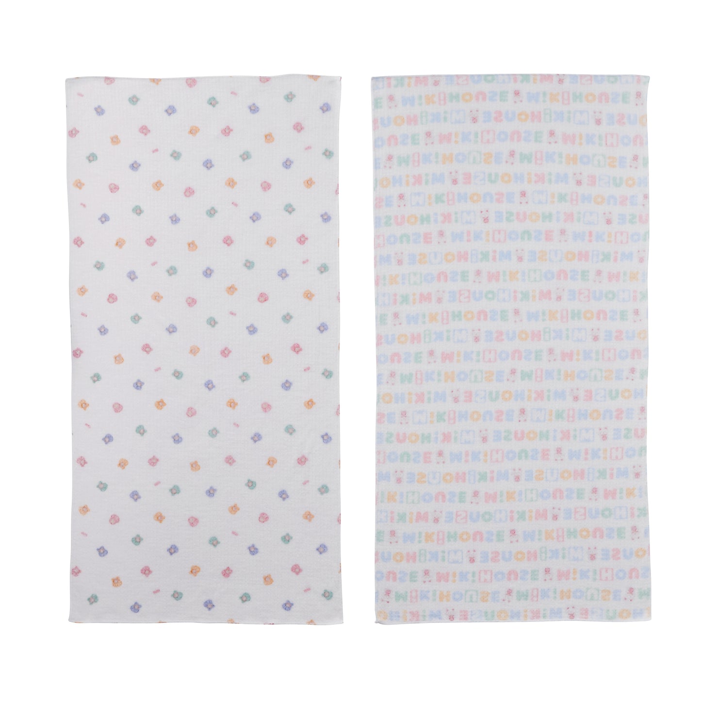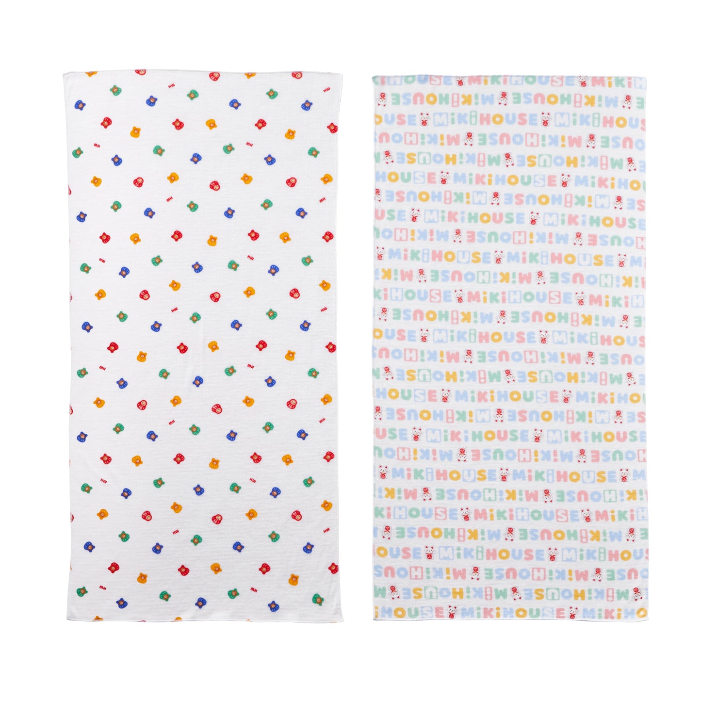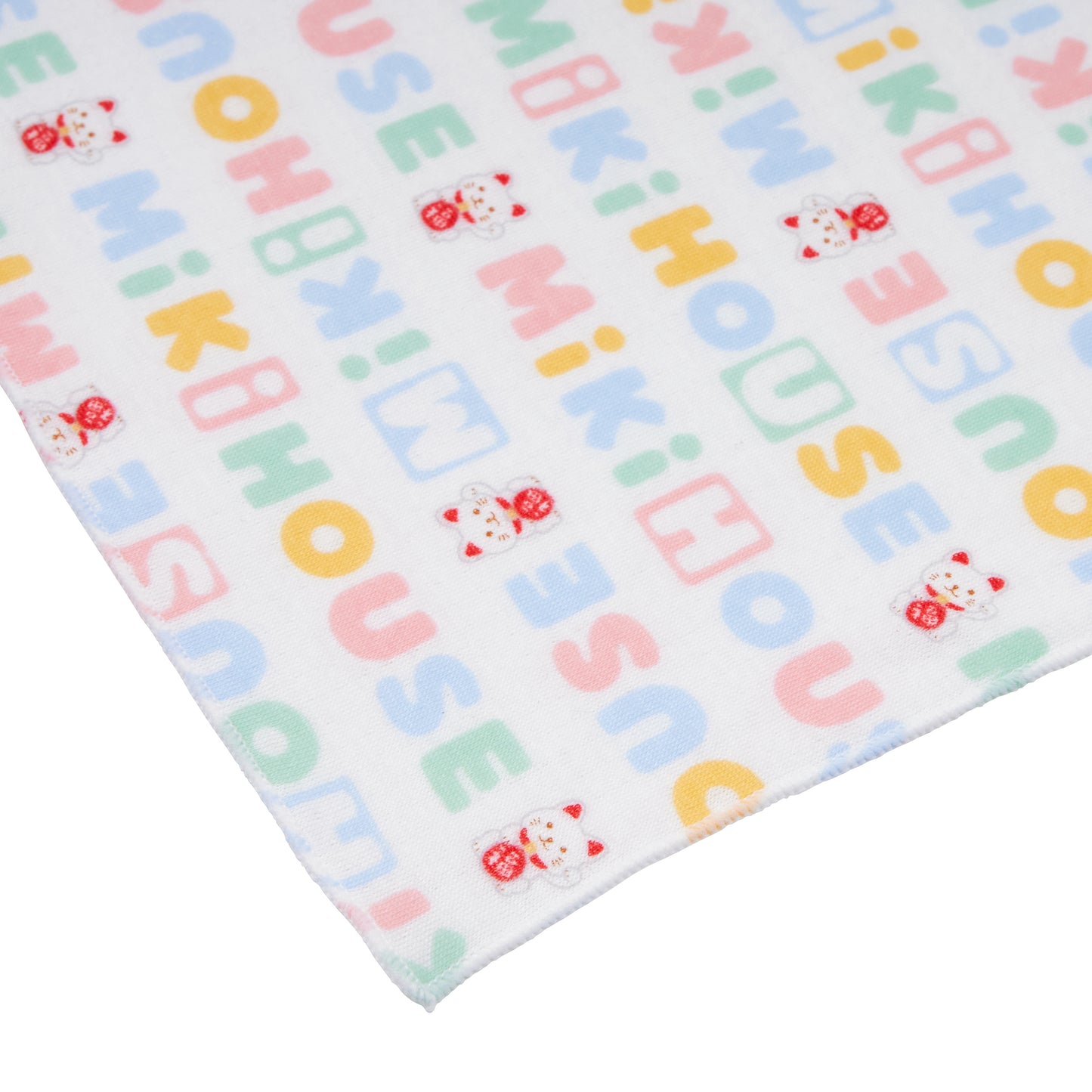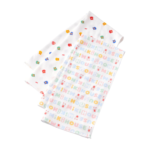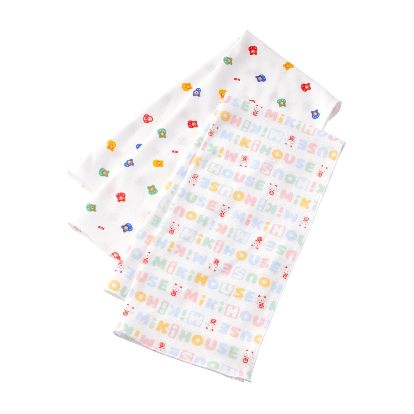 This is a two-piece gauze towel set with a Fukudama pattern and a Maneki Cat pattern. The auspicious Japanese pattern makes it a great gift for births.