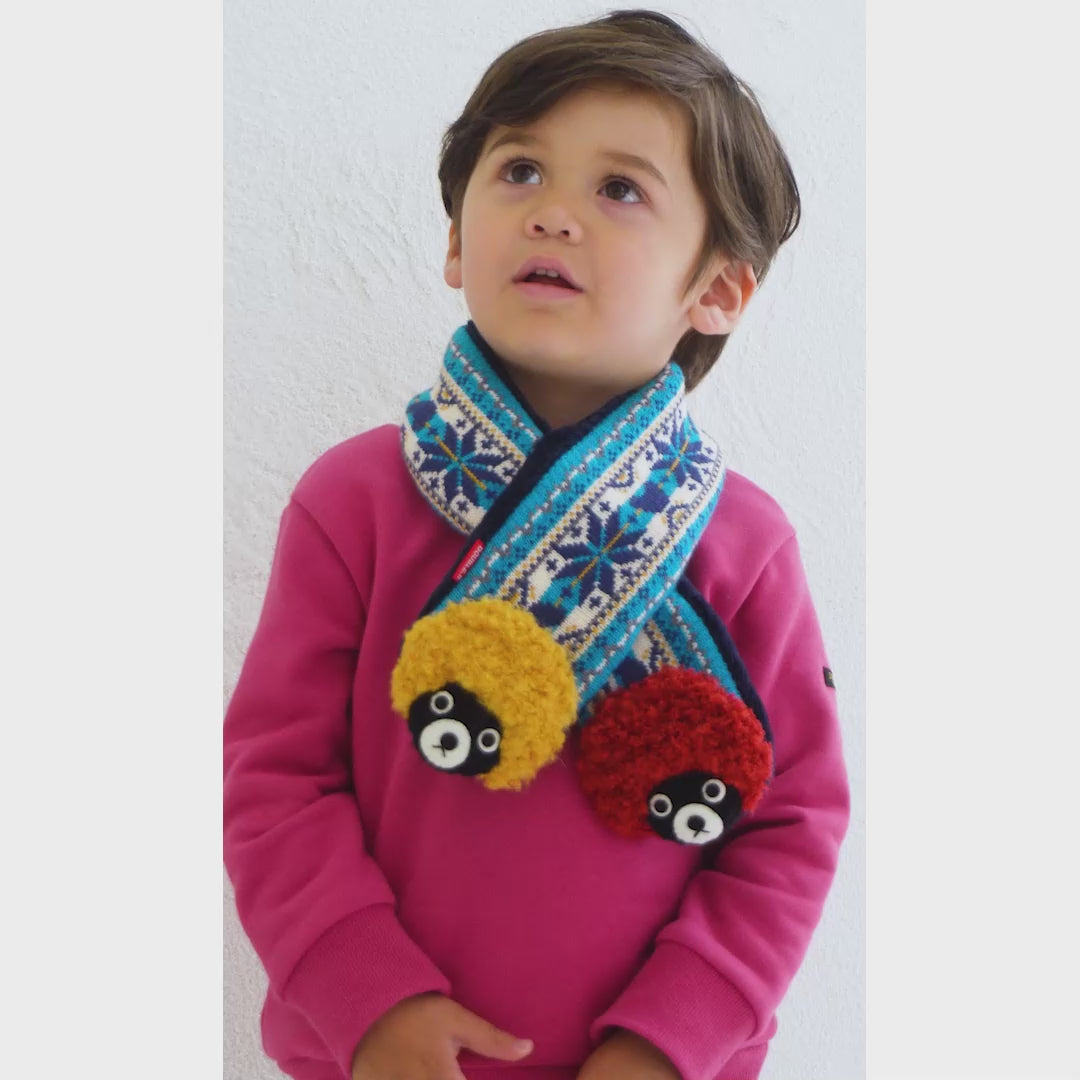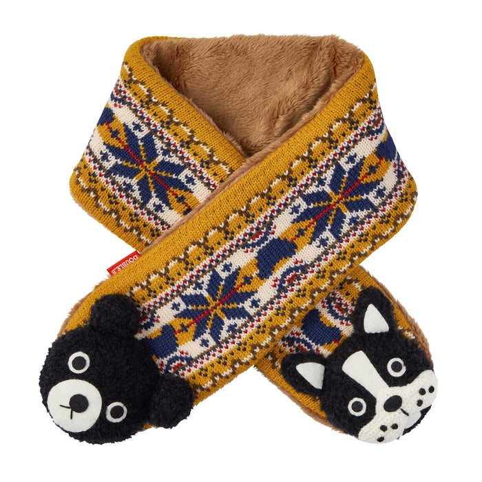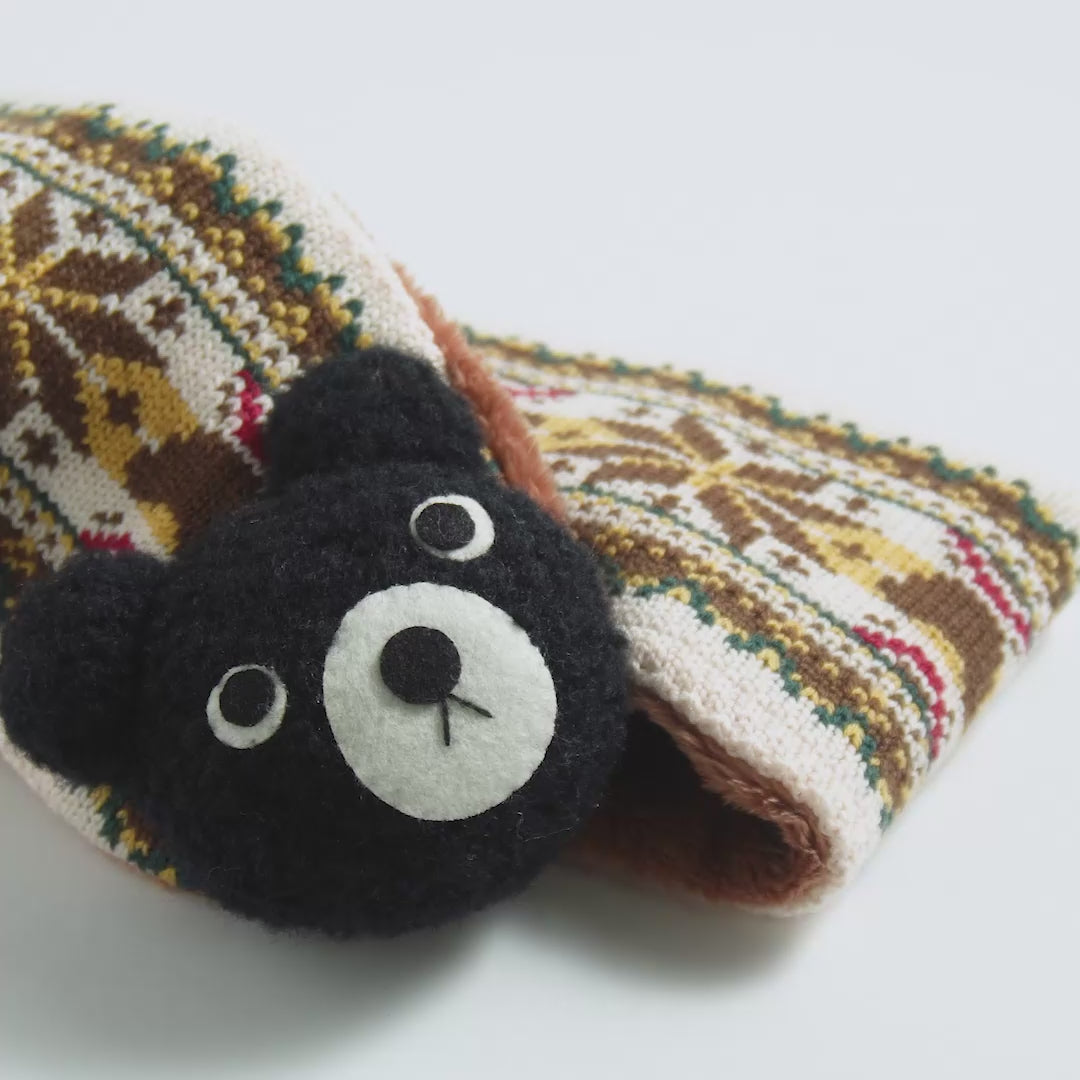 冬の定番ノルディック柄をベースに、クマの立体編みモチーフが付いたマフラーです。ウールのやわらかくて暖かい本来の良さは損なわず、アクリルを混紡したオリジナルの素材。寒い冬におすすめです。