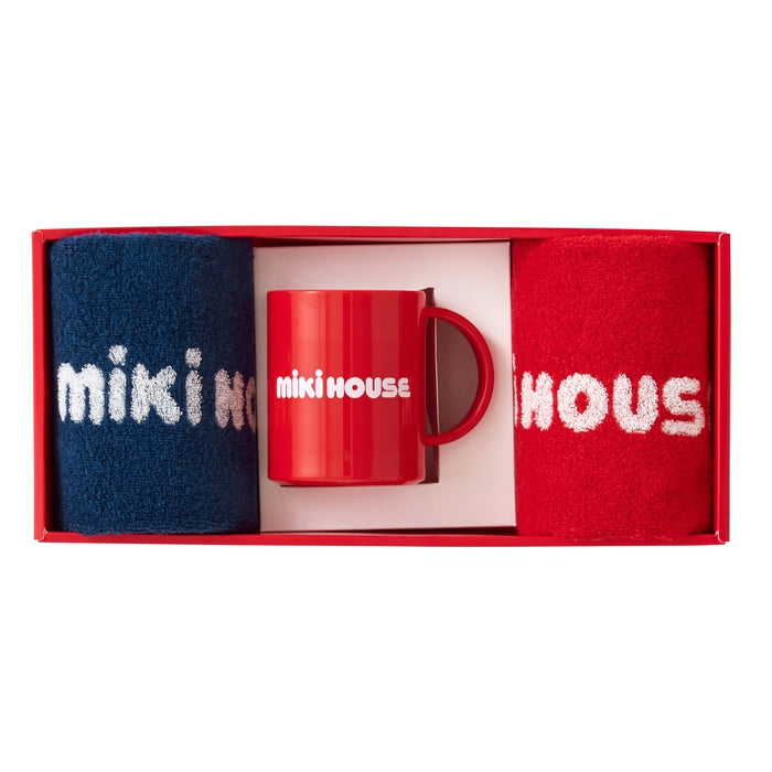 나는 그것을 얻었다 고 기쁘다MIKI HOUSE로고가 달린 Imabari 타월과 머그잔 세트.