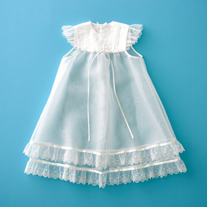 아기의 건강한 성장을 원한 화려한 순수한 흰색 드레스.