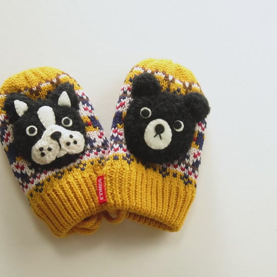 冬の定番ノルディック柄をベースに、甲部分にクマの立体編みモチーフが付いたミトン(手袋)です。ウールのやわらかくて暖かい本来の良さは損なわず、アクリルを混紡したオリジナルの素材。寒い冬におすすめです。