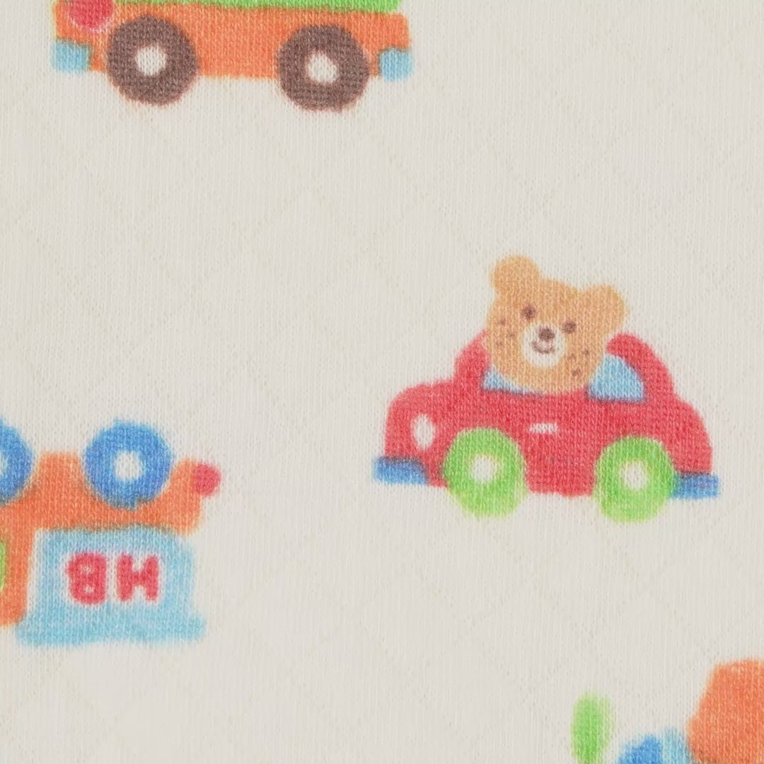 이 긴팔 잠옷은 부드러운 색 콩과 귀여운 차량 패턴이있는 퀼팅 재료로 만들어졌습니다.
