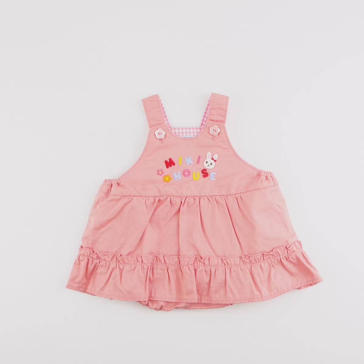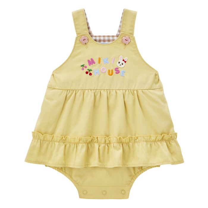 うさことミキハウスのロゴ刺繍が入ったスカート付きのロンパース。