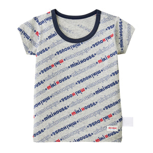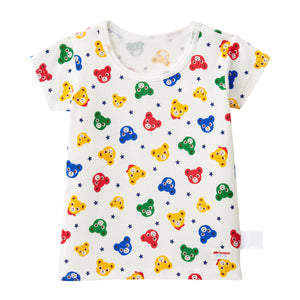 抗菌・抗ウイルス加工が施された半袖肌着。マルチカラーのプッチーとミキハウスロゴの総柄プリントで、お着替えを楽しくしてくれます。