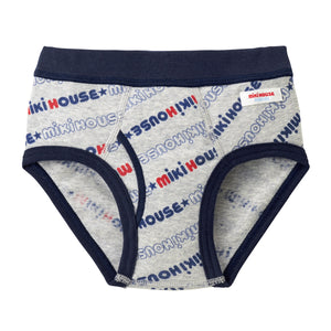 抗菌・抗ウイルス加工が施されたブリーフパンツ。マルチカラーのプッチーとミキハウスロゴの総柄プリントで、お着替えを楽しくしてくれます。