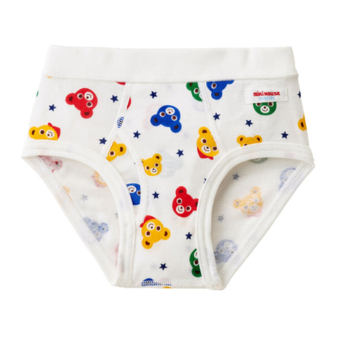 抗菌・抗ウイルス加工が施されたブリーフパンツ。マルチカラーのプッチーとミキハウスロゴの総柄プリントで、お着替えを楽しくしてくれます。