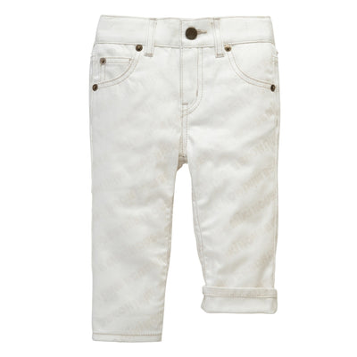 ミキハウスのロゴがプリントされたデニム生地はとても個性的。柔らかさと特別な風合いを出すために、洗い加工とねじれや縮みを抑える加工を施しています。