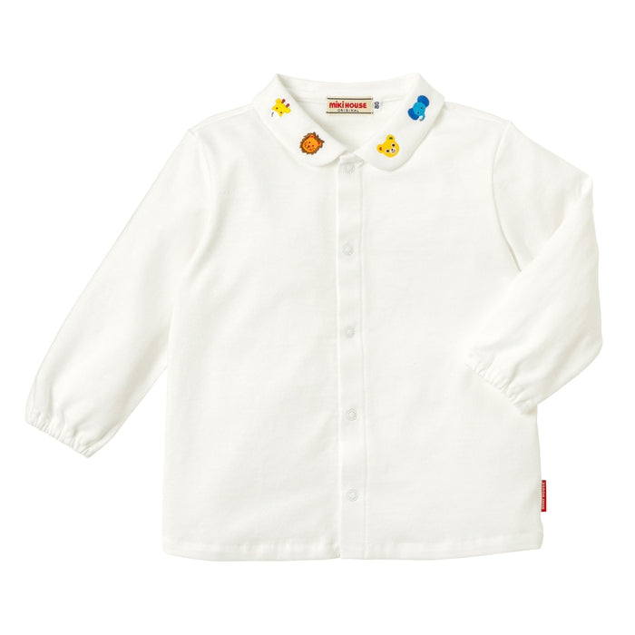 襟にプッチーとアニマルたちの豪華な刺繍を施した長袖ブラウスです。