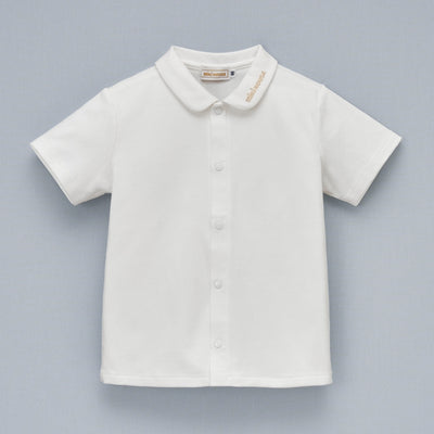 左の襟元にに金糸でミキハウスロゴをあしらった半袖ブラウス。上品でシンプルなデザインだからこそ、上質感が伝わる一着です。