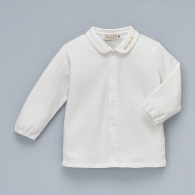 左の襟元にに金糸でミキハウスロゴをあしらった長袖ブラウス。上品でシンプルなデザインだからこそ、上質感が伝わる一着です。