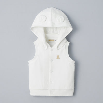 海島綿の接結カノコ天竺を使用したベストです。かわいい耳付きのフードに、胸元にはラメ糸でワンポイントのベア刺繍を施しました。