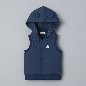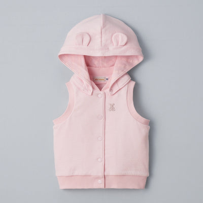 海島綿の接結カノコ天竺を使用したベストです。かわいい耳付きのフードに、胸元にはラメ糸でワンポイントのベア刺繍を施しました。