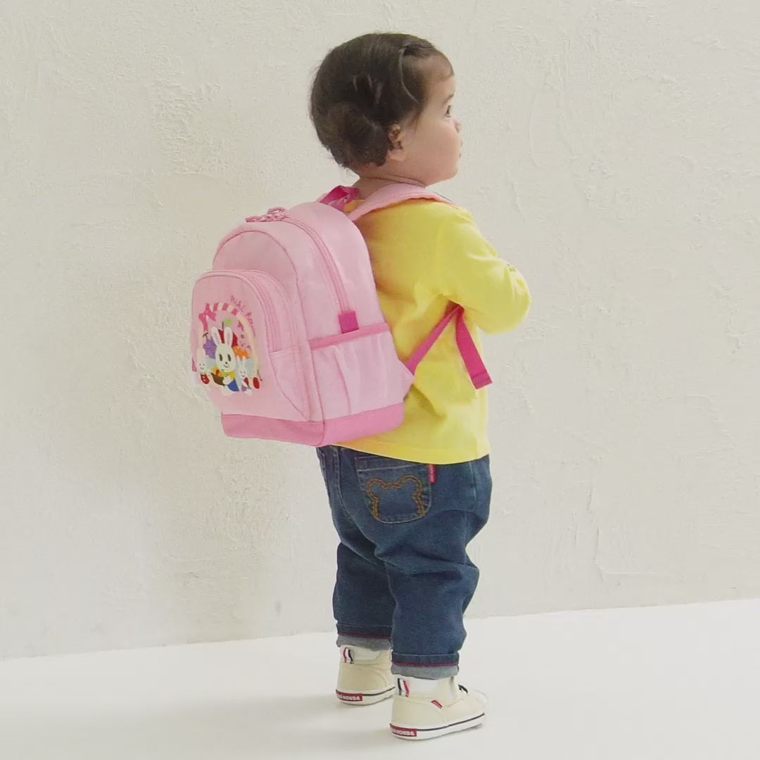 ・背あては通気性のよいメッシュ素材で、プッチーとうさこのシルエットをかたどったかわいいステッチが入っています