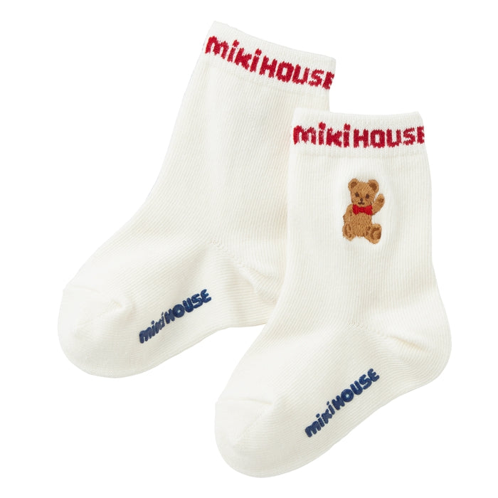 ミキハウスベアのワンポイント刺繍が付いた、シンプルで汎用性の高いソックスです。