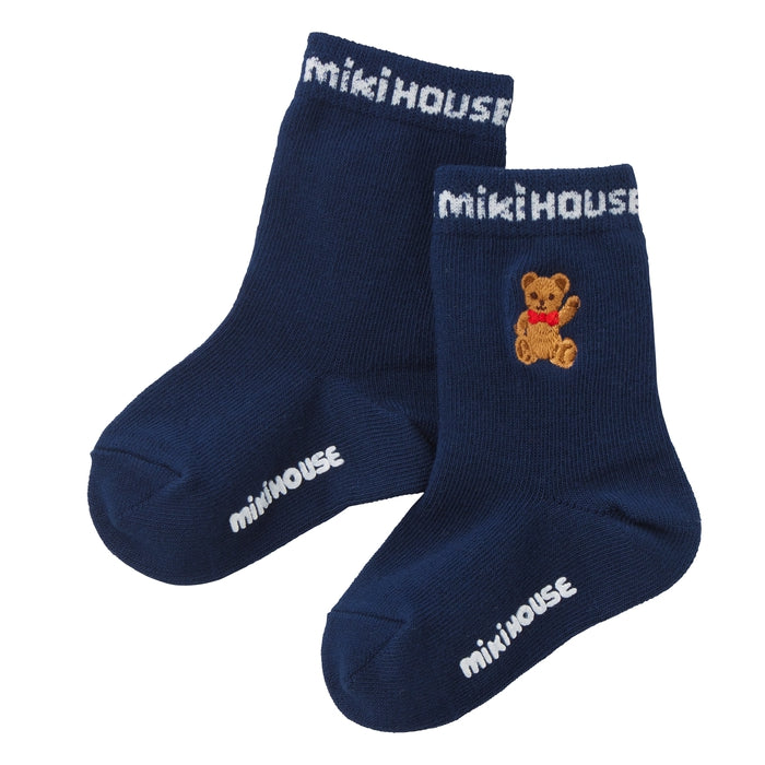 ミキハウスベアのワンポイント刺繍が付いた、シンプルで汎用性の高いソックスです。