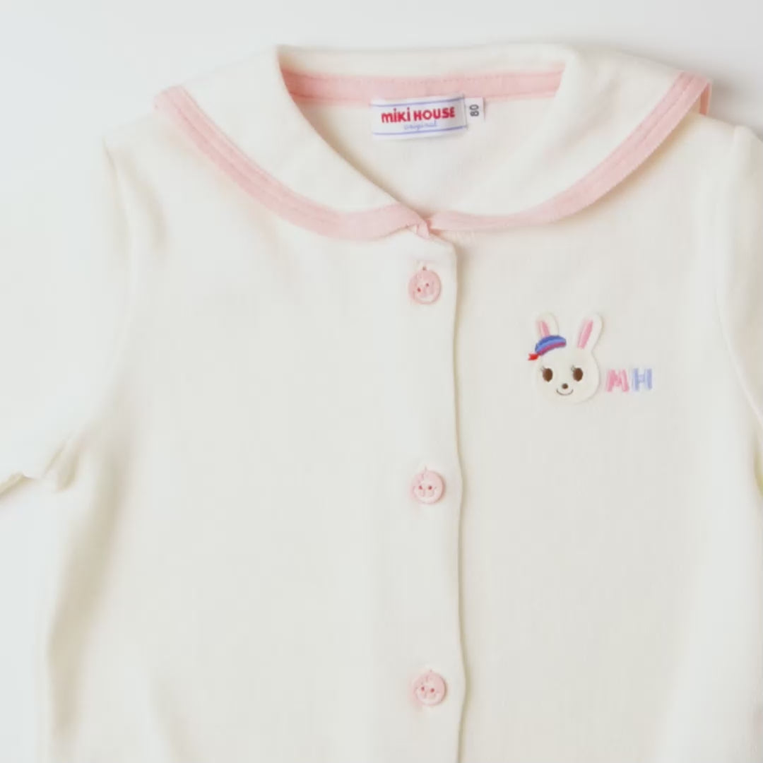 前身頃はワンポイントのワッペンでシンプルなデザインですが、後衿部分には水兵うさこがデザインされていてミキハウスらしさもばっちり。