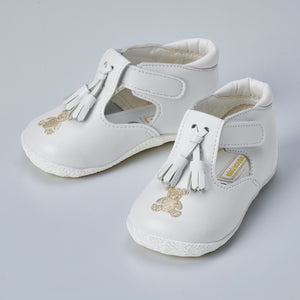やさしいオフホワイトのアッパー色とベアのゴールド刺繍が、上品かつ華やかな印象です。ベーシックなデザインですが、さまざまなコーディネートに上質感を添えてくれるアイテム。