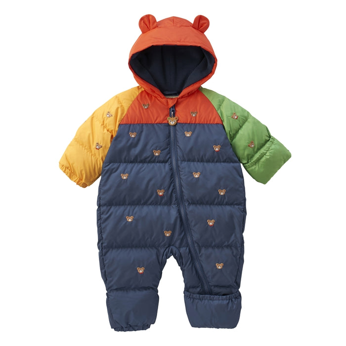 ダウンを使用した総刺繍のジャンプスーツで、しっかりと防寒できる赤ちゃんの防寒カバーオールアイテムです。