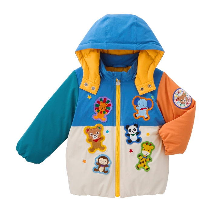 プッチー・うさことミキハウスフレンズのワッペンが全面に散りばめられたダウンジャケットです。