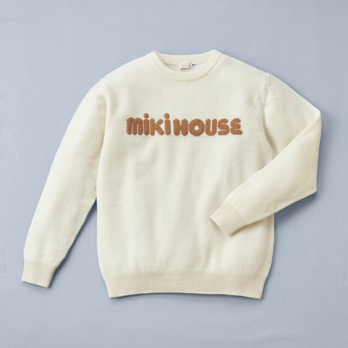 シンプルなデザインの中にミキハウスのロゴが引き立つベビーカシミヤのセーター。