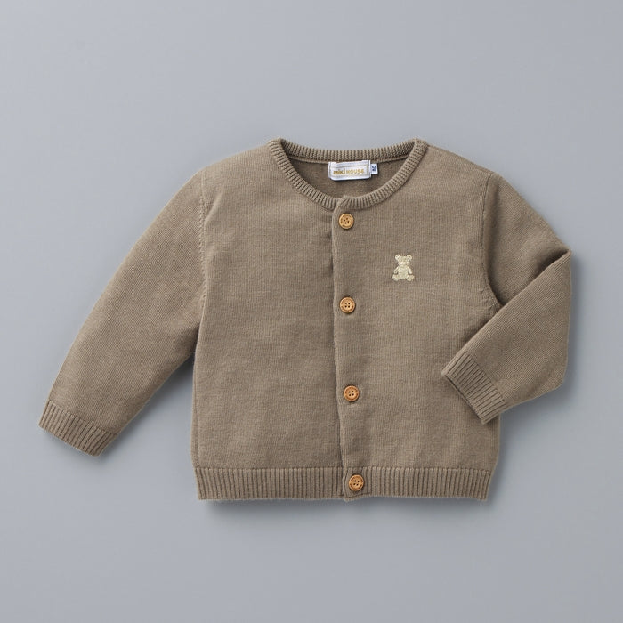 「MIKIHOUSE」のロゴが入った木目調のボタンがアクセント。