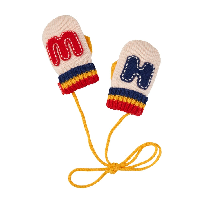 手の甲の部分にあしらわれた大きな「M・H」のワッペンが目を引くミトンです。