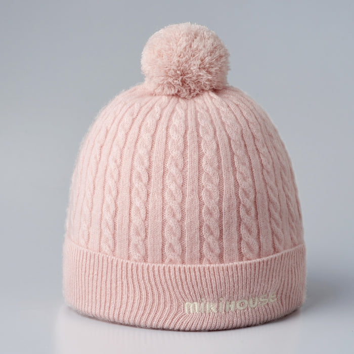 伝統的な縄のように編むケーブル編みに、ロゴをポイントに入れたベビーカシミヤのフードです。