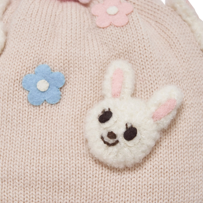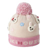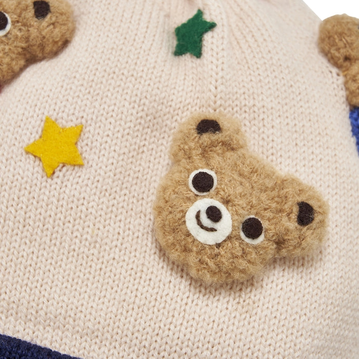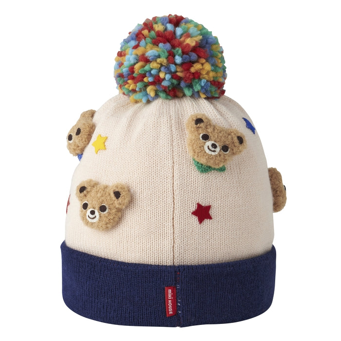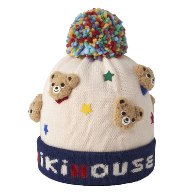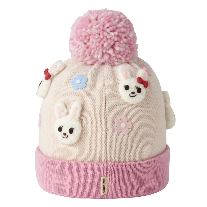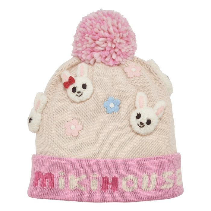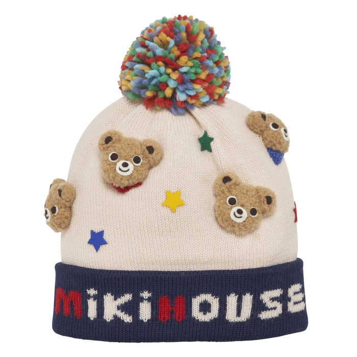 大きなボン天がとってもキュートなニットフード(ニット帽)です。ミキハウスのロゴと、プッチーとうさこの編みモチーフを贅沢にあしらったニット帽子です。