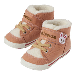 もこもこな見た目もかわいく、甲ベルトのmikihouseロゴやキャラクターのお顔がお子さまらしいシューズです。