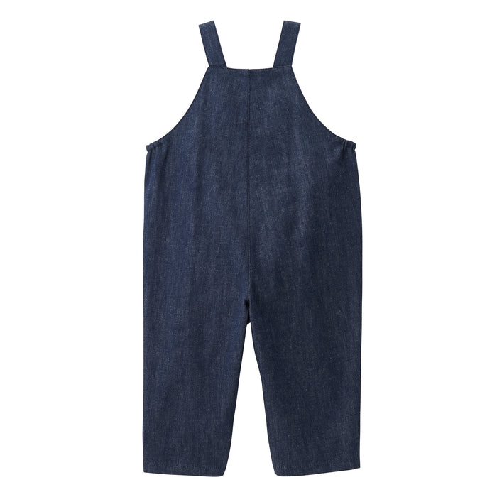 ・オーバーオールは薄手のデニム素材で履き易く、肩紐はボタンで二段階に調節可能