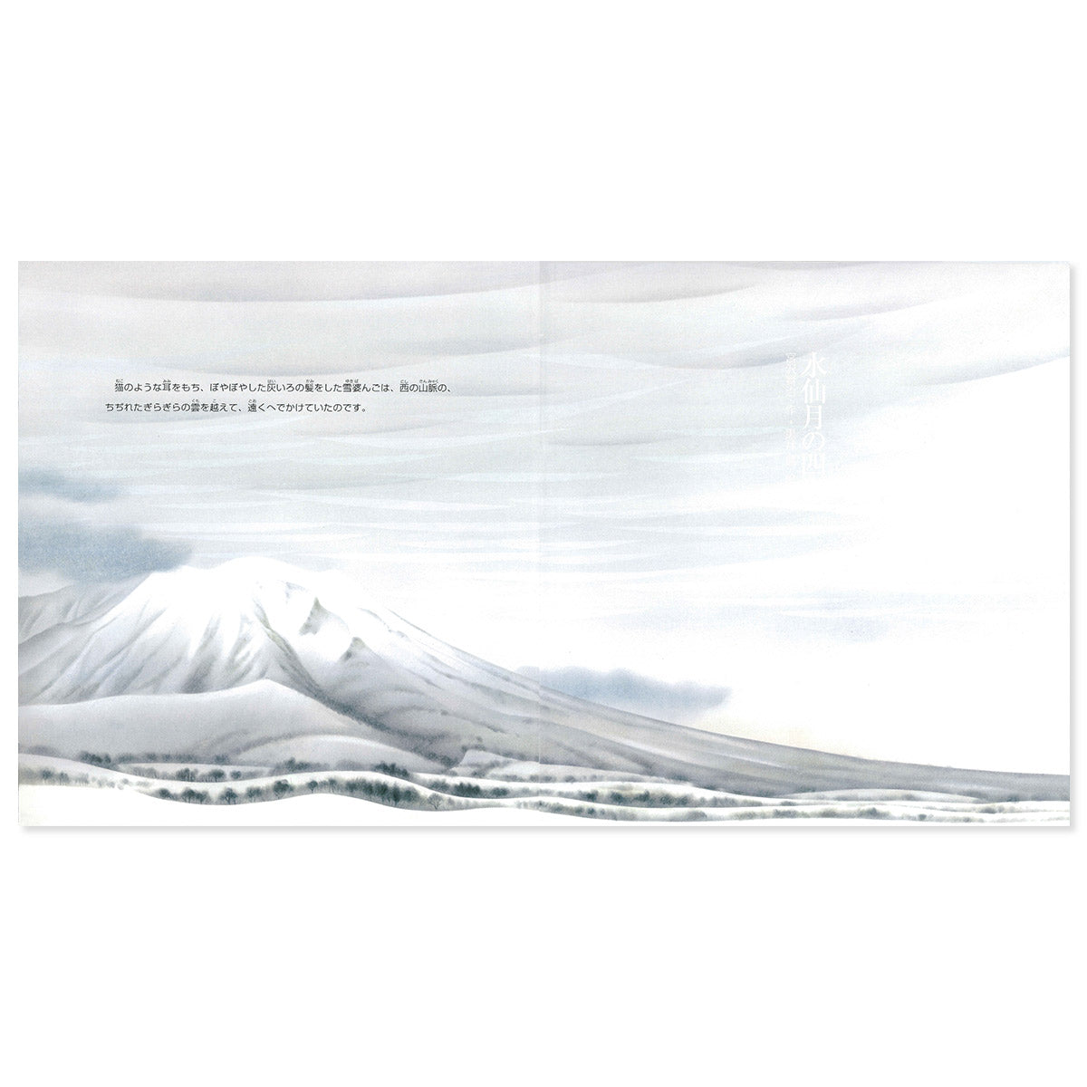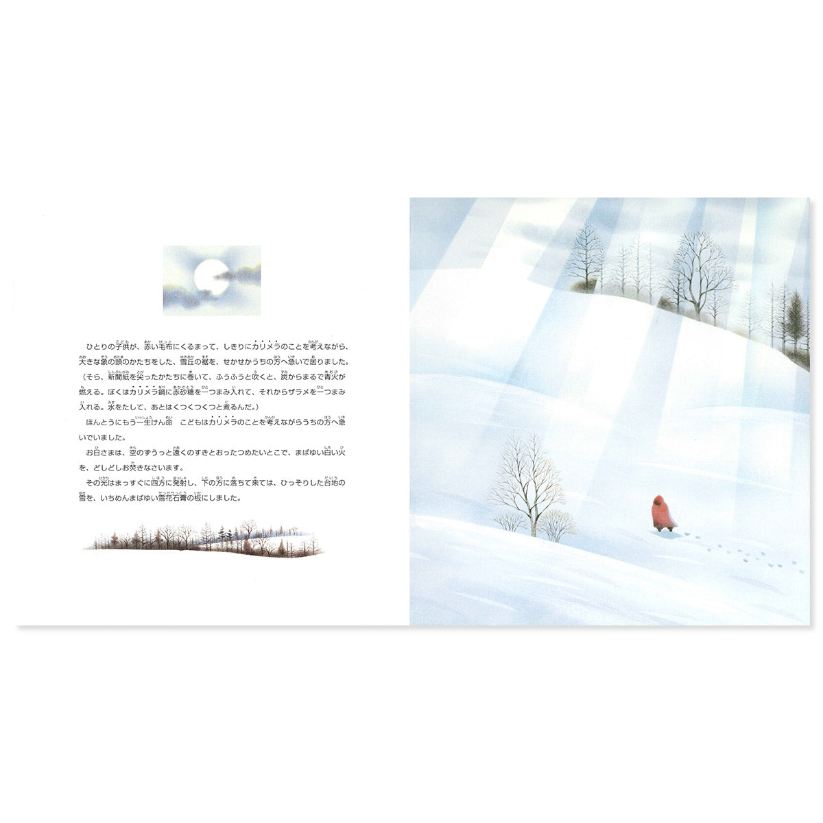 柔らかく繊細なタッチの鉛筆画で描かれた世界。冬の冷たさと美しさを「青」と「白」で、そこに映える子どもの「赤」は生命の力を連想させます。