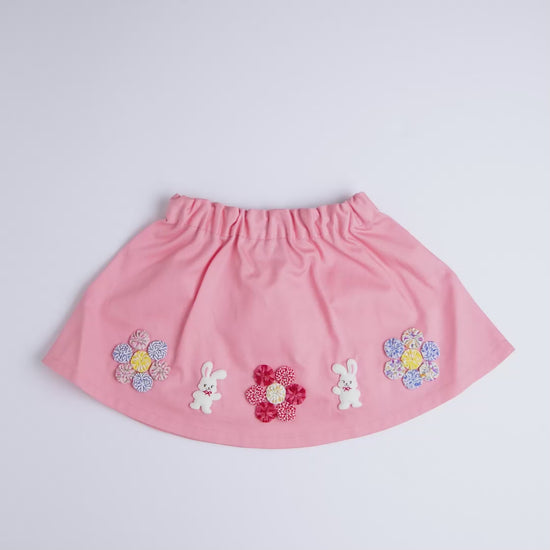 ヨーヨーキルト技法で作られたお花がたくさん付いたスカートです。花びらに仕立てたパッチワークがとてもオシャレなデザイン。同シリーズのベストやブラウスと合わせて、セットアップで着て欲しいアイテムです。