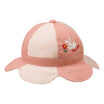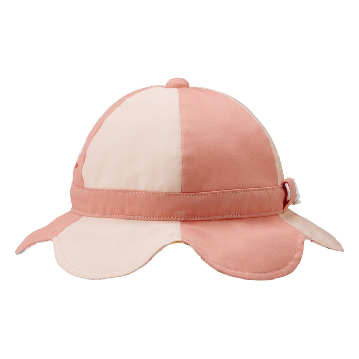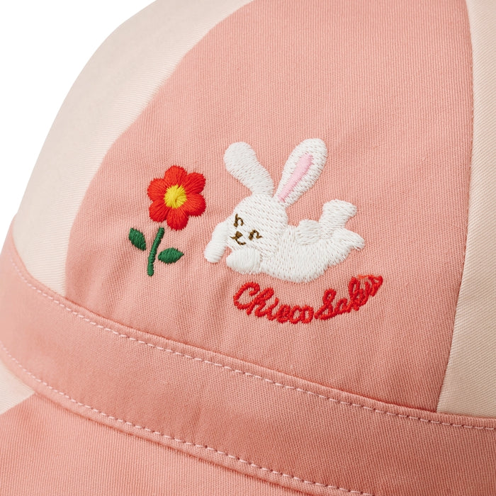 チエコの愛らしい刺繍と、ピンクの濃淡で変化をつけた帽子、チューリップハットです。つば裏まで、女の子らしく仕上げた帽子は、毎日かぶりたくなるかわいさ。