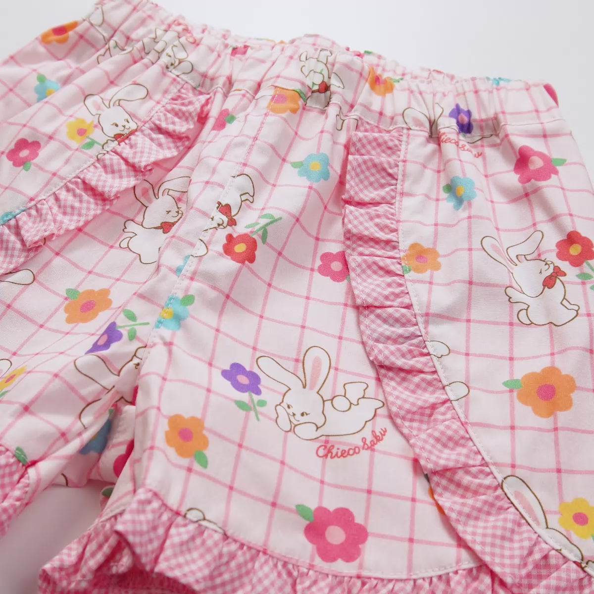 ギンガムチェックのフリルが華やかなハーフパンツです。オリジナルなプリント柄で、どんなトップスと合わせてもチエコサクらしいコーディネートに仕上がります。同柄のブラウスとセットアップが、かわいくておすすめ。