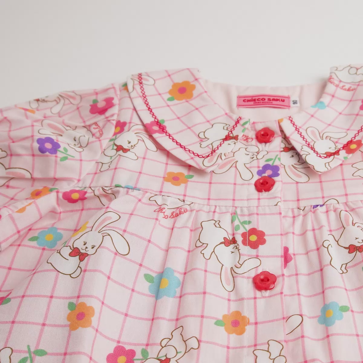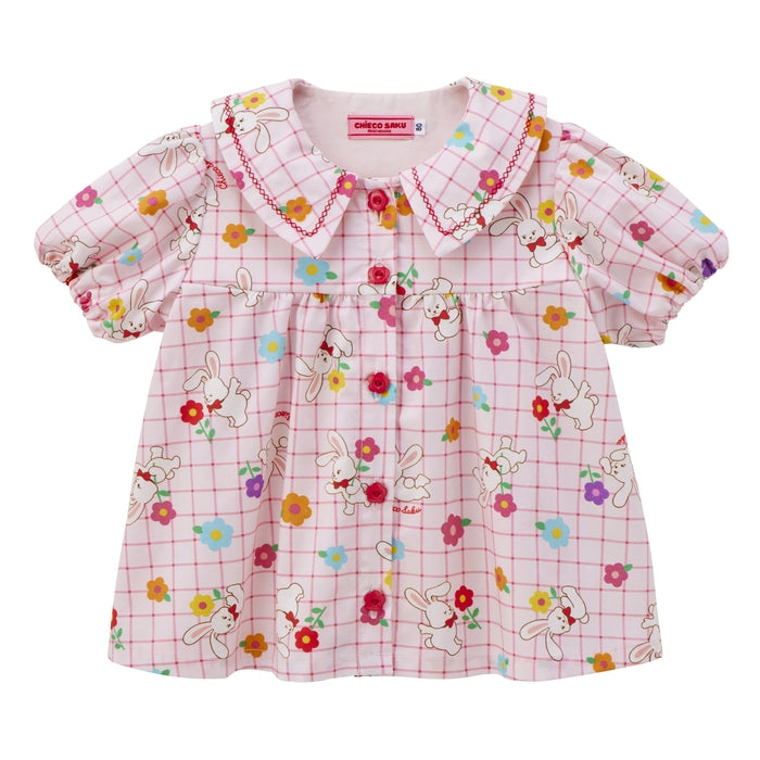 大きめの襟がかわいいオリジナルプリント柄のブラウスです。同柄のハーフパンツとセットアップもおすすめです。
