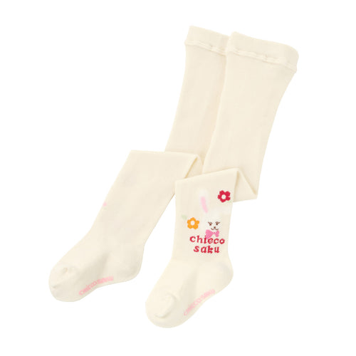リボン柄の綿素材タイツです。チエコがお気に入りのリボンがいっぱい付いたデザイン。ニットアイテムとの全身コーディネートがかわいくて、おすすめのコーディネートです。